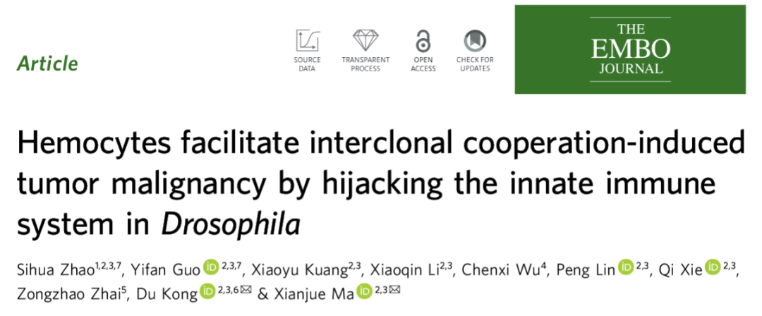2025年8月22日,西湖大学生命科学学院/西湖实验室马仙珏课题组在《The EMBO Journal》发表了题为《Hemocytes facilitate interclonal cooperation-induced tumor malignancy by hijacking the innate immune system in Drosophila》的研究论文。该研究借助新型果蝇细胞间通讯肿瘤模型,揭示了异质性肿瘤与微环境中的免疫细胞通过细胞间通讯推动良性肿瘤向恶性表型转化的新机制。