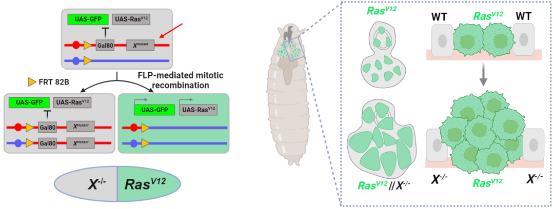 为了解决这一关键科学问题,马仙珏课题组在本研究中改进了经典的MARCM系统,构建了一个新型的RAS异质性肿瘤遗传筛选模型(图1)。利用该模型,结合EMS(甲基磺酸乙酯)这一化学诱变剂,研究人员能够在RAS肿瘤克隆的相邻细胞中特异性诱导随机基因X的纯合突变,从而观察X突变是否促进相邻RAS肿瘤的过度增殖。