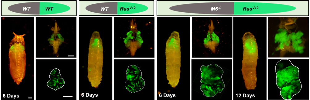 图2 M6-/-克隆促进相邻RasV12克隆转化为恶性肿瘤