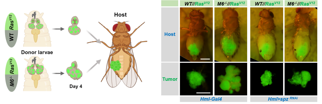 图4 果蝇巨噬细胞通过细胞间通讯促进RasV12//M6-/-异质性肿瘤的机制图