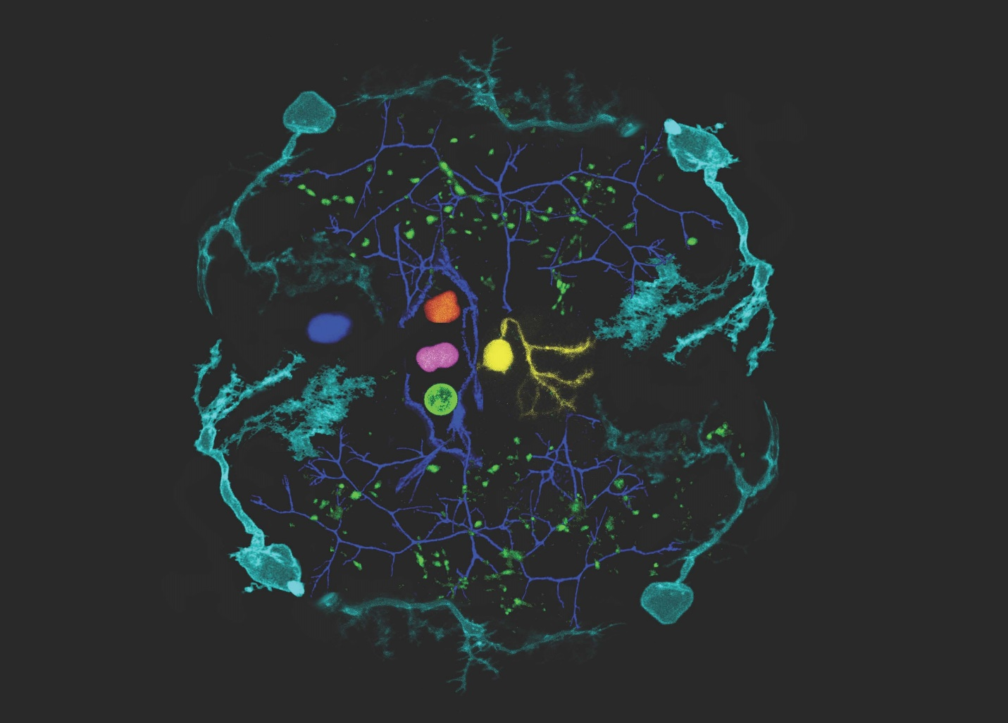 The edited fluorescence images of the zebrafish larval brain expressing achromatic variants of fluorescent proteins. The brain-shaped maze is surrounded by cerebellar Purkinje cells (Cyan) from zebrafish larvae, whereas the inner walls, which mimic cerebrovasculature, are made of long, growing axons of their motoneurons (Blue). The idea of this montage comes from 1980s video games with iconic neon-colored components. The major characters in this ‘game’ are made of cell bodies of hindbrain neurons (Green, Pink, Orange) showing beautiful, peculiar morphology, scoring points scattered in the maze, which are made of pre-synaptic signals in Purkinje cell axons (green puncta).(credits to Kazuhiko Namikawa from TU Braunschweig)